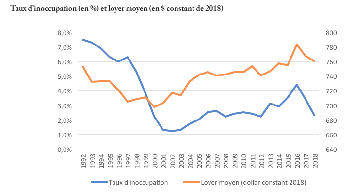 Le marché du logement est à l’équilibre lorsque le taux d’inoccupation est autour de 3%. Le graphique ici-bas montre que le marché était en faveur des locataires dans les années 1990s et en faveur des propriétaires en 2001-2003. Combien d’années va t’on avoir des bas taux d’inoccupation? Les experts débattront sûrement dans les prochains mois et plusieurs mesures correctives seront proposées.