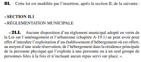 Suite aux pressions des municipalités, cet article n’entrera en vigueur que dans 2 ans, soit le 25 mars 2023. La location de courte durée sera permise partout pour une résidence principale, à moins qu’il y a un règlement municipal en place qui ne l’interdise ou le restreint avant ce délai de 2 ans. Par la suite, le règlement restera valide. Ce règlement doit être adopté par référendum.